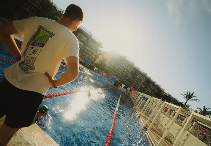 Der Nachmittag ist für die zweite oder sogar dritte Einheit reserviert: eine Technik-Session im Pool, ein Koppeltraining oder eine Athletik-Einheit, die es in sich hat. Aber auch für das, was genauso wichtig ist: Beine hochlegen am Pool, Erfahrungen austauschen und merken, dass man gerade mit Leuten fachsimpelt, die man erst gestern kennengelernt hat.